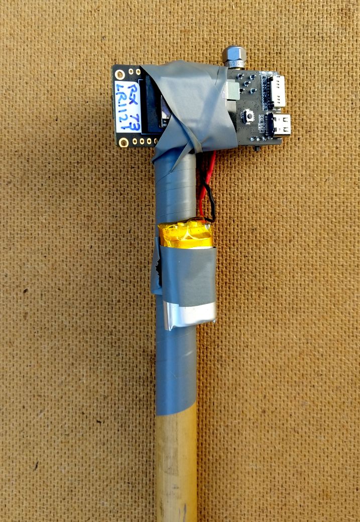 If you look at the picture of the T3-S3 taped to a bamboo pole above, the antenna has been replaced by an SMA terminator. The terminator provides a good impedance match but also significantly reduces the amount of radiated RF power from the LoRa transmitter. This reduction is about 30dBm.