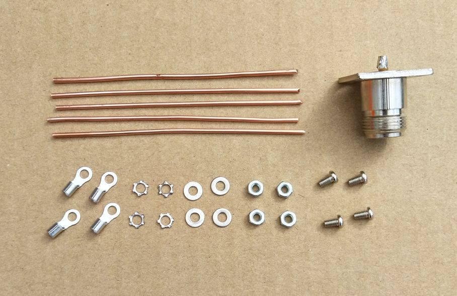 Crimp and solder the tags to the end of the 4 radials and fit with short M3 screws and nuts to the 4 mount holes in the chassis N-Type socket. Solder the fifth wire to the centre pin on the chassis socket. You will need an N-Type pug to SMA adapter to fit this antenna to the T3-S3.